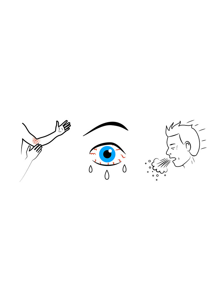 Contudo, caso entre em contato com as substâncias dos produtos mencionados acima e você seja alérgico, é possível que apresente os sintomas relacionados à pele (pele vermelha e pruriginosa ou eczema alérgico), ao nariz (espirros, secreção ou prurido) ou aos olhos (prurido ou lacrimejamento).
