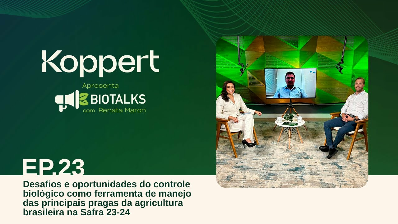 A jornalista e apresentadora Renata Maron recebe no estúdio do videocast Koppert Biotalks o gerente de desenvolvimento de mercado, Marcelino Borges de Brito e o pesquisador e entomologista da Cooperativa Central Gaúcha Ltda (CCGL), Glauber Renato Stürmer. Eles apresentam o tema desafios e oportunidades do controle biológico como ferramenta de manejo das principais pragas da agricultura brasileira na safra 2023/24.