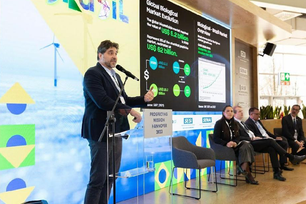 O diretor comercial da Koppert Brasil, Gustavo Herrmann, participou da Missão Prospectiva na Feira Industrial de Hannover, na Alemanha. Representando a Croplife Brasil, Herrmann fez parte do showcase “O Papel da Bioeconomia para a descarbonização”, com outros representantes brasileiros.