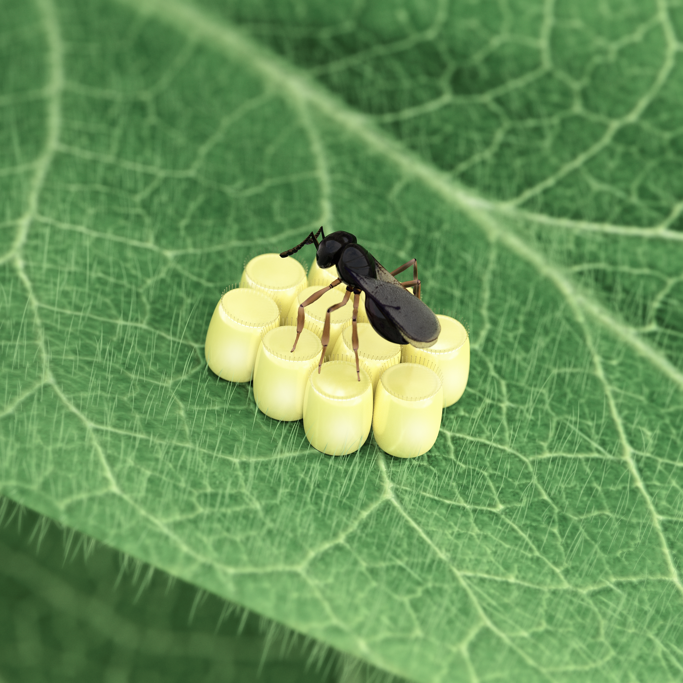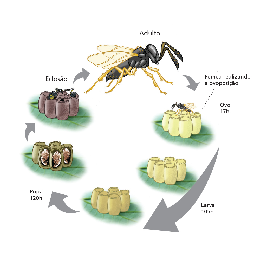 3 - A vespa emerge do ovo do hospedeiro e busca por ovos do inseto-praga.