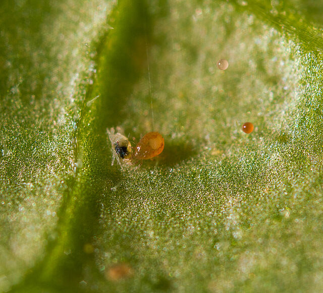 O ácaro predador Spical-C (Neoseiulus californicus) está disponível em um frasco.