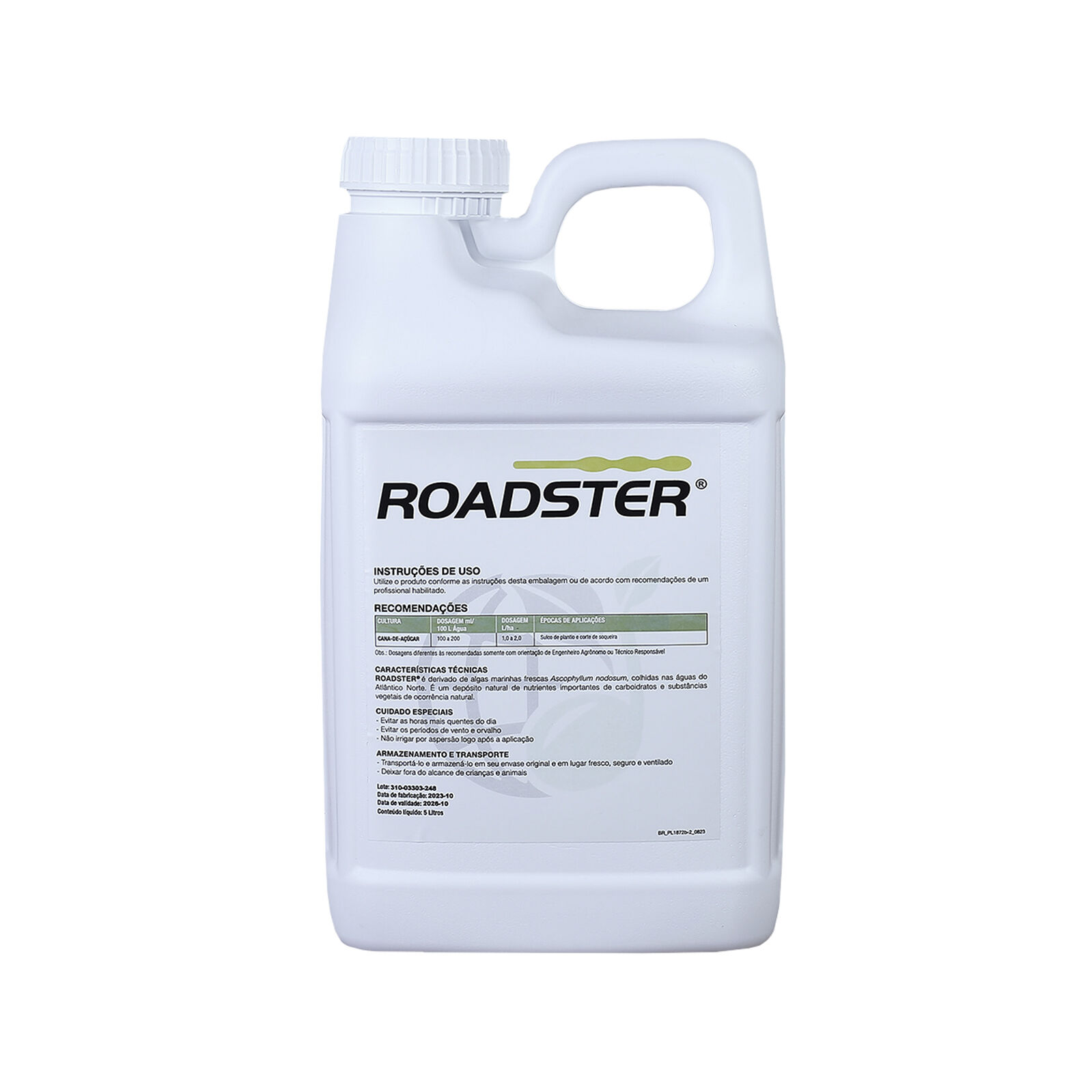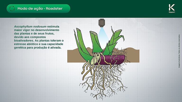Roadster é um líquido solúvel em água, adequado para aplicação foliar, no solo (sulco), por gotejamento, fertirrigação e aplicação aérea.
